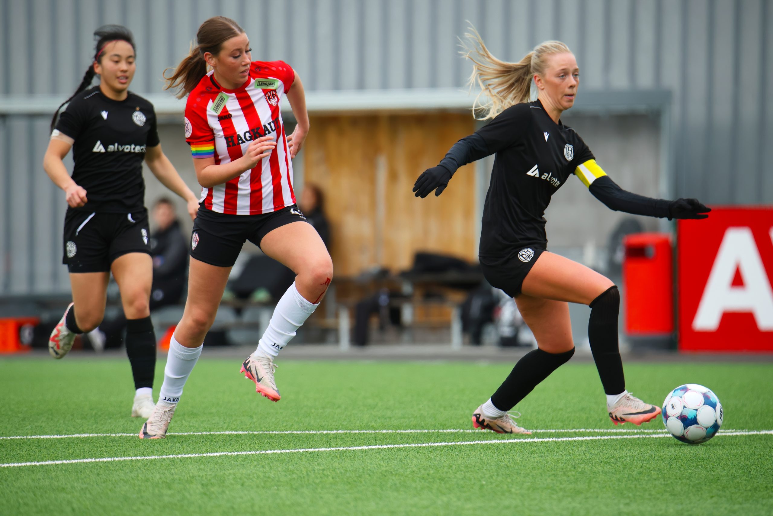 KR captain Eva María Smáradóttir on the ball while opposing skipper Steinunn Lára Ingvarsdóttir and teammate Hildur Björg Kristjánsdóttir play catch-up. Eva came to KR last August from Fjölnir while Hildur has grown up in the KR system and played in all three divisions. Steinunn is earlier in that journey but has played for the national team at U15 level.