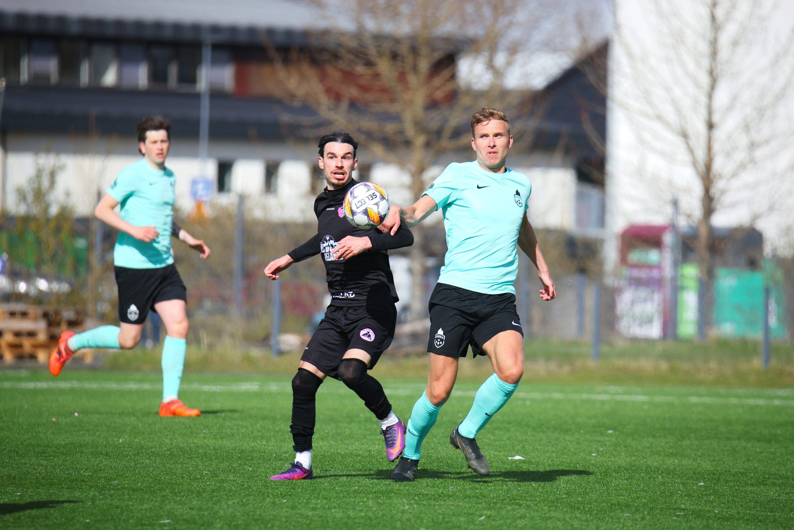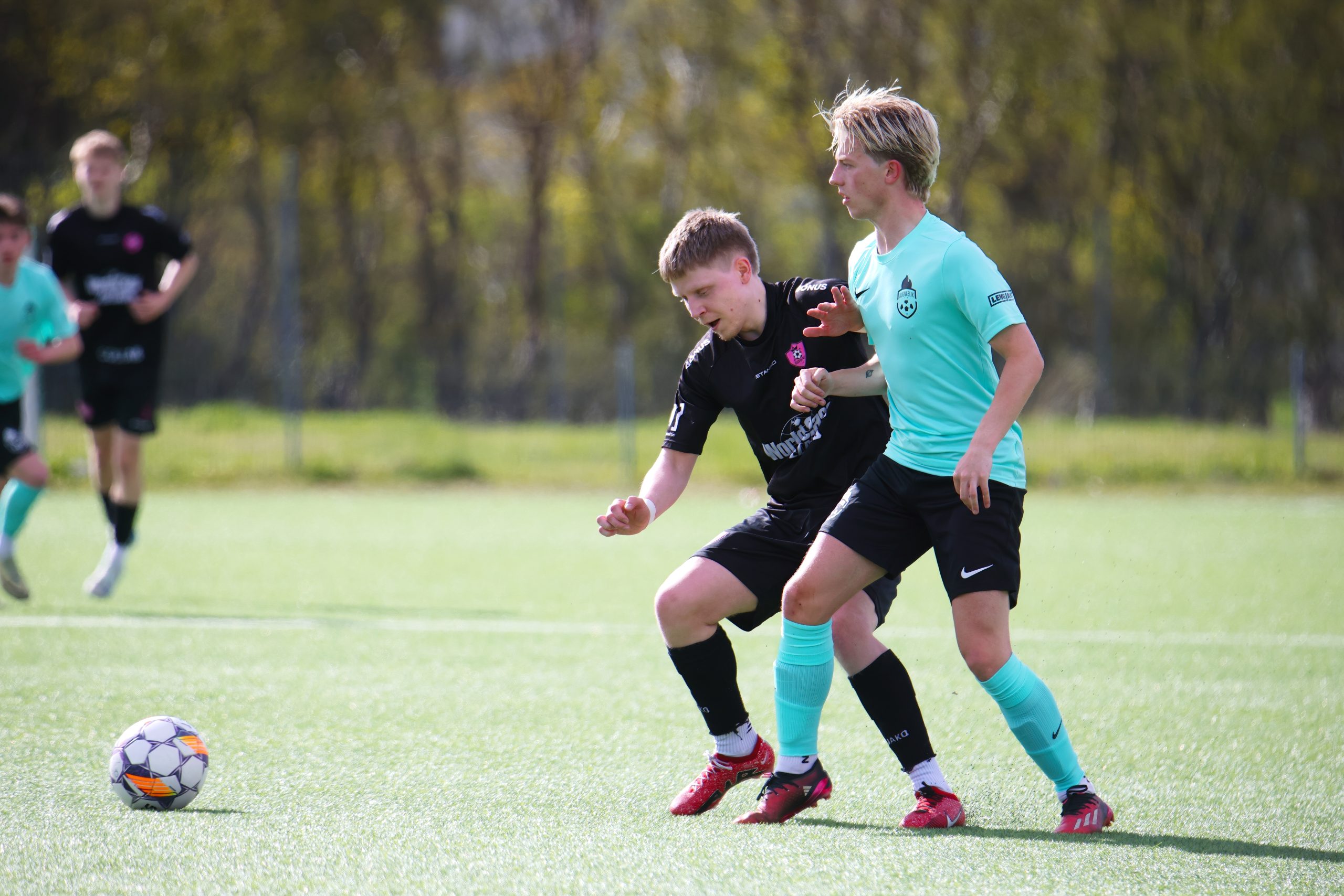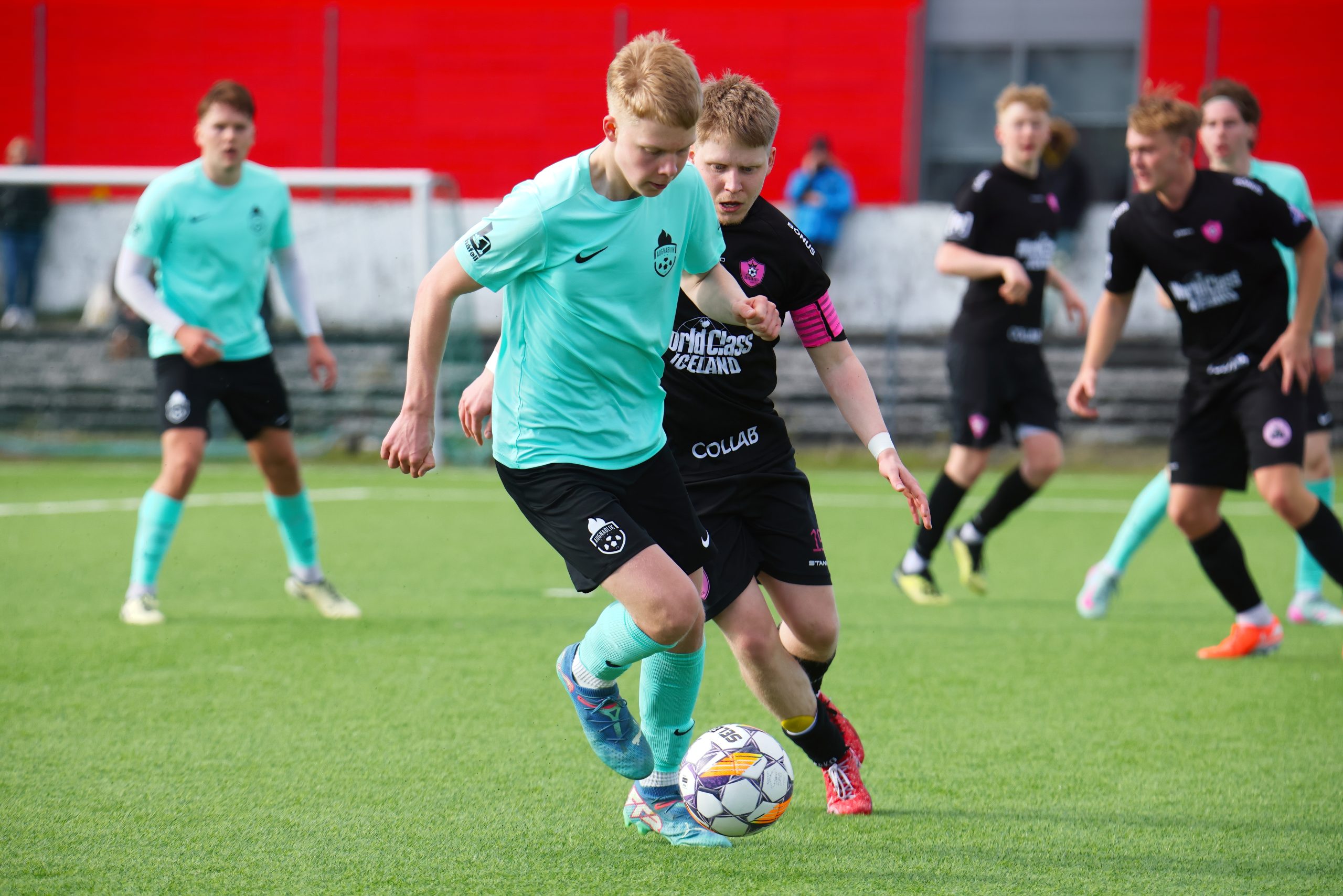 Orri Bjarkason had put the visitors ahead with only 3 minutes played, and here he carries the ball away from Agnar Guðjóns. 2007-born Orri is in his first season with a senior team and this was his first senior goal.
