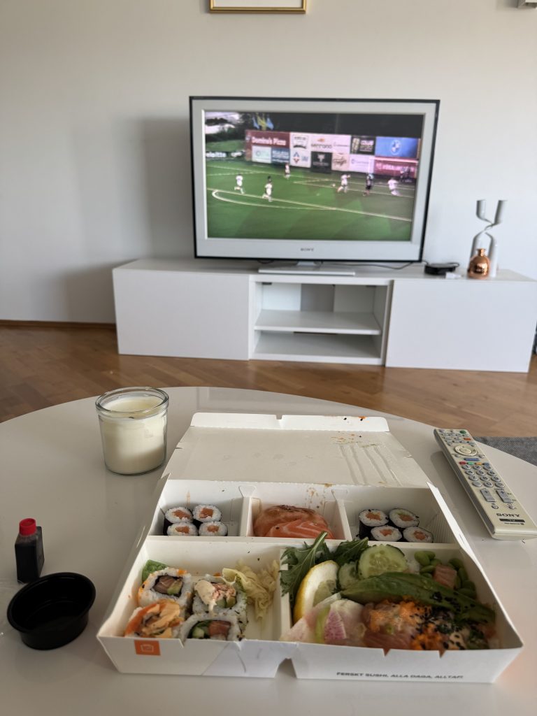 “Finished off the day watching some footy and eating sushi. You can clearly tell sushi is my favorite food.”
